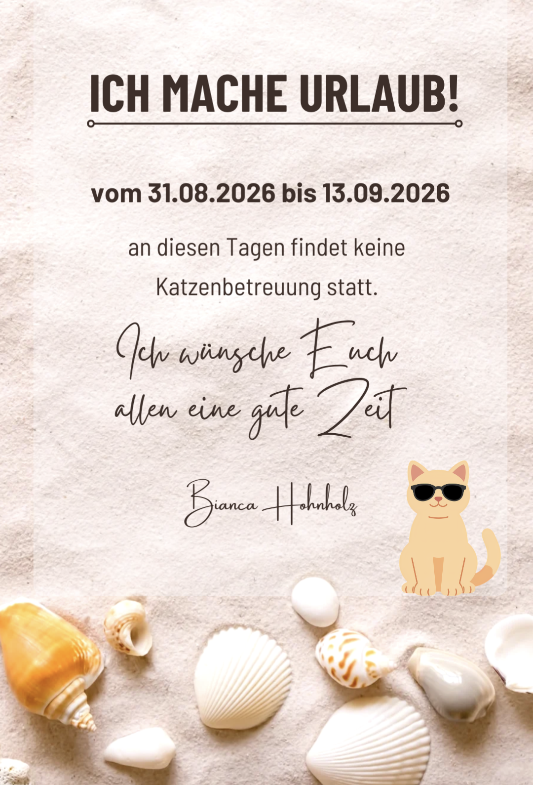 Du möchtest deine Katze /deinen Kater in guten Händen wissen, wenn du in den Urlaub fährst, oder dich aus sonstigen Gründen nicht um dein Tier kümmern kannst? Ich betreue dein Tier bei dir zuhause im gewohnten Umfeld, denn Katzen fühlen sich in ihrer bekannten Umgebung am wohlsten. Stressfrei für Mensch und Tier!
